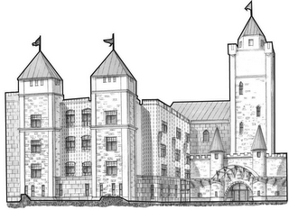 The mark consists of trade dress comprising a three-dimensional configuration of the exterior of a building depicting a castle and the front entrance of the castle wherein applicant's services are provided. Specifically, the building exterior has a cobbled brick façade. The castle has three towers. The main wing of the building is fronted by two, parallel towers with turrets at the top, and flags extending from the top of each turret. The parallel towers have three, ground floor windows, and single windows on the next three flours. To the left of the parallel towers, there is high cobbled brick wall. To the right, the castle entrance is arched and has four (4) glass doors, there are seven (7) flags hanging from and extended across a parapet above the entrance, there are two (2) turrets that extend from the roof above the parapet, in the background of the building entrance there is high cobbled brick wall next to a cobbled brick façade tower. The tower has a turret at the top, and a flag extending from the top of the turret. The broken lines as shown in the drawing are not part of the mark but serve to give perspective and to indicate positioning of the mark.
