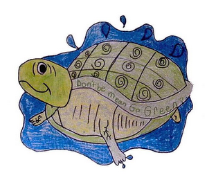 The mark consists of a turtle with a green shell and head, and yellow body, in a blue puddle of water with the words "Don't be mean Go Green!" on the edge of the shell.