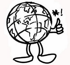 The mark consists of a stylized character comprised of a globe featuring outlines of continents and meridians and parallels, two legs and feet and one outstretched arm with a hand in a thumbs up position alongside an asterisk symbol and exclamation point.