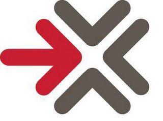 The mark consists of four inwardly facing arrowheads, with the left arrowhead rendered in red and the remaining arrowheads rendered in dark gray. The color white is background and not claimed as a feature of the mark
