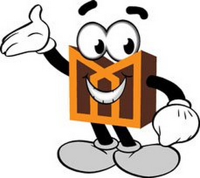 The mark consists of an orange "M" design with brown stripes. The design features eyes with white background and black dots, black arms, legs and eyebrows and gray shoes.