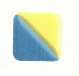 The color yellow for the triangle on the top of the design, and the color blue for the triangle on the bottom of the design. Also, the color brown-green shown at the lower edge of the yellow triangle which is used as shading to indicate that the yellow triangle is "below" the raised blue triangle, and the color light blue is claimed for upper edge of the bottom triangle giving it a three dimensional "Button" look.