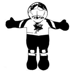 The mark consists of a shark wearing a hockey uniform consisting of a white jersey with teal and grey stripes, black pants with teal and gray stripes, black gloves, and black boots.