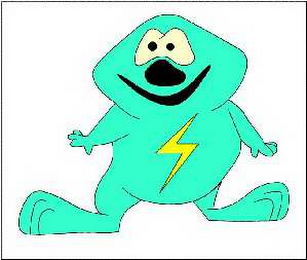 The mark consists of an aqua figure having a yellow lightning stroke on its belly, a black mouth and nose, and black and white eyes.