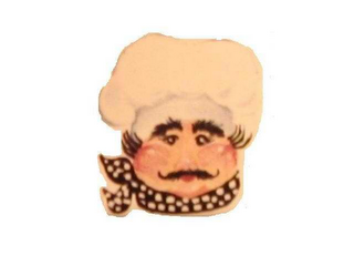 The mark consists of an artistic rendering of a chef with rosy-red colored cheeks and chin, black eyes, eyebrows and hair and a black mustache wearing a black and white checkered scarf and a white chef's hat with black trim.