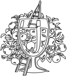 The mark consists of a filled wine glass with an apple tree and orchard ladder behind, the apples and leaves of the tree are seen through the liquid in the glass and outside the borders of the glass, and the ladder is shown outside the glass and through the upper portion of the glass.