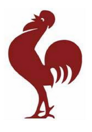 The color red appears in the French cockerel design and the color white appears in the eye of the French cockerel.