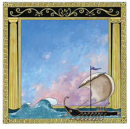 The mark consists of a gold and black patterned frame in a rectangular shape, with gold columns having black detailing lines on the inside of the left and right sides of the frame. Along the top of the frame, under the border, is a black rectangle with a pattern of gold curving lines. The inside border of the frame is gold with black lining, and it frames a blue sky with white and light purple and pink mottled clouds rising up from the bottom. Along the bottom of the mark, inside the border, is a body of blue water with waves rising up on the left hand side, and a ship on the right hand side. The ship is black, with gold detailing, and has light brown oars coming out of the side. It has a white sail with gray shading, tied to a black mast and looking as if blown to the right by the wind. At the top of the black mast is a purple triangular flag. The ship, sail and oars and water are outlined in black.