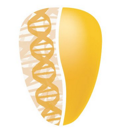 The mark consists of a seed kernel with a slight S-shaped white line extending vertical from top center of kernel to bottom center of kernel; the right side of the kernel is yellow with the top 1/3 a slightly lighter shade of yellow giving the image of light reflecting off kernel; the left side of kernel having a white background with two lighter shaded yellow double helixes side-by-side imposed thereon; imposed upon the lighter shaded double helixes is one yellow double helix.