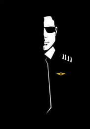 The mark consists of a black rectangle that shows the right half of a silhouetted upper torso of a man. The right half of his face appears in white and he is wearing black sunglasses, a tie, outlined along the right side in white, a white collar, a striped insignia on the right shoulder in black and white and a set of pilot's wings, yellow and black in color, pinned to the right upper chest.
