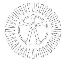 The mark consists of There is an outer circle of needles pointing inwards ? the needles have a flat back end, extend straight inwards in a rectangular form, and then each side of the rectangle form narrows inward towards a point. Inside the outer needle circle is an inner circle. Enclosed in the inner circle is what appears as a stick-figure shape of a human that is laid out with both arms and legs extended outwards. The head, each of the two hands, and each of the two feet are in the form of a circle, and those circle form breaks in the inner circle. There is also a circle at the center point of the stick figure. The head and neck, the arms, and the legs do not touch the center point circle; there is a white space opening between the center point circle and each of the five lines extending out for the legs, arms, and head..