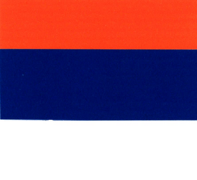 Pantone 165, pantone 281. The trademark consists of three stripes in the colors orange (pantone 165), blue (pantone 281) and white, which may vary in thickness and which trail off the page.