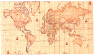 The mark consists of an outdated world map with horizontal and vertical lines that intersect across the face of the map and a spotted background. The mark consists of the colors brown, beige, white, grey, orange, green and black, the color brown appearing in the outlines of the countries and continents and in the horizontal and vertical lining, the colors beige and white appearing in the background area of the map; the colors grey, orange and green alternatively appearing in the interior of the countries and continents and the color black appearing in the names of geographical locations.