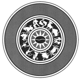 The mark consists of thirteen concentric circles; the inner circle contains a 12-pointed star with a bean shape in the center; the fifth circle contains the following zodiac symbols: 1) the Ram; 2) the Bull; 3) the Twins; 4) the Crab; 5) the Lion; 6) the Virgin with wings and holding wheat; 7) the Scales; 8) the Scorpion; 9) the Centaur the Archer; 10) the Sea-goat; 11) the Water Bearer consisting of a man with water flowing from hand; and 12) two Fish; the 10th circle being larger than the rest.