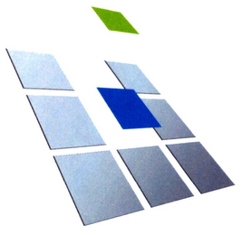 The mark consists of nine quadrilaterals, with seven of the quadrilaterals containing the colors light grey and dark grey, one quadrilateral containing the color green, and one quadrilateral containing the color blue.