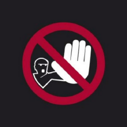 Square on black background, circle with a red diagonal line through the centre; white outline of a character and a hand in white.