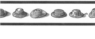 The mark consists of six different brimmed hats side-by-side in a horizontal line where only one half of the first and sixth hats appear with shadowing appearing around the hats and solid horizontal bands appearing above and below the hats.