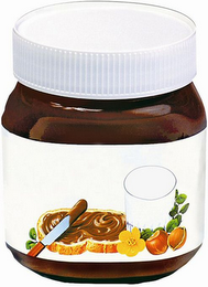 The mark consists of a depiction of a brown jar with a white lid with shaded white vertical lines representing ridges and a white label. There is a beige slice of bread with a light brown crust and a dark brown spread on top on the bottom left side of the label. There is a silver knife with a light brown handle and dark brown spread on the tip leaning against the slice of bread. There are two green leaves to the left of the slice of bread. There is a yellow flower in front of the right corner of the slice of bread. There is a white drinking glass outlined in silver to the right of the slice of bread behind the yellow flower. There are green leaves in the front of the bottom of the drinking glass. There are two light brown nuts in front of the leaves.
