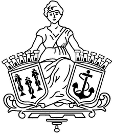 The mark consists of a representation of a woman dressed in a robe holding two shields in front of her, each surmounted by five towers, the shield on the left is decorated with three fish and the shield on the right with a sea ship's anchor; the woman is on an ornate ledge/platform.