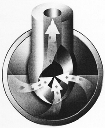 The mark consists of from right, left, and bottom, three arrows with dots are pointing to a central opening in the body portion of the device in the form of a thick vase which is cut off partially in the body portion. A fourth arrow also dotted points up through the midportion of the vase. A rimed circular device which is divided horizontally into upper and lower halves is allocated behind the vase.