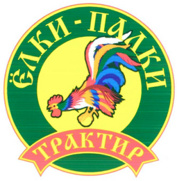 The mark consists of concentric circles in the following colors: the outermost circle is red, followed by yellow, then green, then yellow for the internal most circle. In the green circle, there are Cyrillic characters that are written in yellow and transliterate to "ELKI-PALKI". A multi-colored rooster is in the center yellow circle. The rooster's feathers are white, black, red, green, dark green, blue, dark blue, and biege. An arched red ribbon or banner is below the rooster. The red banner is outlined in yellow and contains yellow Cyrillic characters that transliterate to "TRAKTIR".