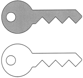 The mark consists of a horizontal shaded key with the key head on the left side and with the key cuts facing down, the shaded key head has a small light circle in it, directly below, and parallel to, the shaded key is a horizontal light key with the key head on the left side and with the key cuts facing down, the light key head has a small light circle in it. The white background is not a feature of the mark.
