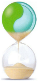 The mark consists of the following: an hourglass; the top circle is a ying-yang pattern with the left side of the ying-yang design in light green and the right side of the ying-yang design in light blue with dark blue around the edges and sand colored sand covering the bottom 1/6 of the design; the bottom circle of the hourglass is clear glass with reflections and 1/3 full of sand. The color white represents background, outlining, shading and/or transparent areas and is not apart of the mark.