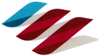 The mark consists of a design of three quadrilaterals with grey shadowing, with the topmost quadrilateral in sky blue and dark blue, and with the middle and lower quadrilaterals in dark burgundy and light burgundy.