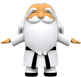The mark consists of a stylized image of a man with black eyes, yellow skin, a white beard, and grey and white hair, standing with his arms outstretched, and wearing a white taekwondo uniform with a black belt and black and white shoes. The white background is used to show placement, and is not claimed as a feature of the mark.