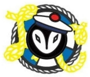 The mark consists of an owl's face in black and white topped with a white cap having a navy blue brim and a red button on top all outlined in black set against a blue, white and black life preserver that features a black and white braided rope border. A loopy yellow and white braided rope appears underneath and to the left and right side of the owl's face.