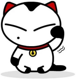 The mark consists of a design of an animated cat in white, black, and red, wearing a red collar with a yellow and black tag; two black shapes of a wave are under the left arm of cat and a gray shadow is under the cat; the outline of the mark is in black.