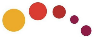 The mark consists of five circles arranged in an arch shape; the first goldenrod circle is the largest and three following circles (in order of maroon red, dark orange and fuchsia) are getting smaller; the last fuchsia circle is slightly larger than the fourth circle.