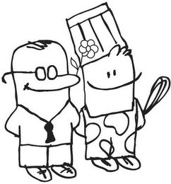 The mark consists of a line drawing of two male cartoon-style characters standing next to each other. The character on the left is a male standing with his hands behind his back and smiling with a small tuft of hair, wearing glasses, a neck tie, shirt, pants and shoes. The character on the right is a male, smiling, standing with his hands behind his back and a spatula sticking out from behind his right side, wearing a hat in the shape of a chef's hat with lines and a flower on it, a long sleeveless outfit with four amoeba-shaped designs on it and shoes.