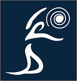 The mark consists of a stylized human figure in white kneeling and reaching toward the sun, which is represented by a white spiral design, all against a blue background. The shape of the background is not part of the mark.