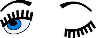 The mark consists of a pair of eyes, with the left eye open with a black eyebrow, black upper lashes, a black pupil, blue retina, and light blue sclera, all outlined in black, and the right eye closed with a black eyebrow and black lashes.