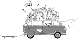 The mark consists of a stylized van featuring a dog's profile wearing sunglasses and hanging out the passenger side window. A decal featuring the geographic outline of Australia is on the back fender of the van. A skateboard is attached to the rear bumper of the van by a rope. Tied to the roof of the van with rope are a palm tree, fruits, a bathing suit attached to a fishing rod, a bicycle, a bird, a life raft, a violin, a suitcase, a sink, a life preserver, and a swimming mask. A flipper and a drink cup with a straw are behind and above the van, but not attached. The rope that is used on the roof extends in front of the van.