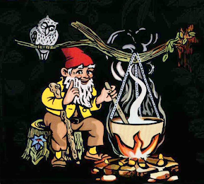 The mark consists of an old man stirring a large pot over a fire. The man's skin is peach, his beard and hair are white, his cap is red, his shirt and socks are yellow, and his pants are brown. He holds a brown walking stick and stirs a brown kettle with a brown pole. The fire below the kettle consists of brown sticks and red and yellow flames. The man is seated on a brown and yellow stump from which a blue flower grows. Above the man's head is a brown branch with green leaves on which a gray owl perches. Steam rising from the fire is gray. The background of the mark is black with faintly outlined green leaves.