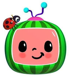The mark consists of a stylized watermelon in green with alternating dark green and light green stripes with a smiling face in pink with red cheeks outlined in white, and with black and white facial features, and antennae in pink, purple and light blue. A red lady bug with black spots and black legs appears on the upper-left part of the watermelon, with white and black eyes with blue iris, and with yellow antenna.