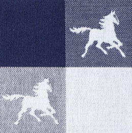 The mark consists of four squares forming a larger square in the colors blue and white, one solid blue, one solid white, and two mixtures of alternating blue and white with stylized horses within them.