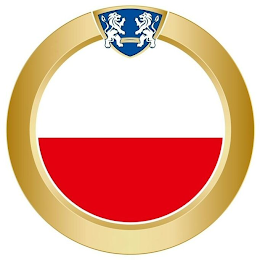 The mark consists of a large gold ring with a design of a blue shield outlined in gold featuring two white lions outlined in blue facing each other across a small gold rectangular figure with a blue horizontal line across its center, with the gold rectangular figure intersecting their knees, and the bottom half of the interior of the ring is red and the top half of the interior of the ring is white.