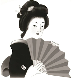 The mark consists of a stylized woman with hair ornaments wearing a kimono and holding a fan. A circle containing three stylized shapes is displayed on the arm of the kimono.