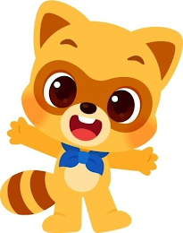 The mark consists of a design of a golden yellow raccoon with a two-brown striped tail and wearing a blue scarf. It has a brown mask around its brown eyes, brown eyebrows, a brown nose, and brown inner ears. It has a bright yellowish-light brown round belly. There are white circles in the centers of its eyes and white areas around the centers of its eyes. Its mouth is dark red with a deep red tongue and a single white tooth.