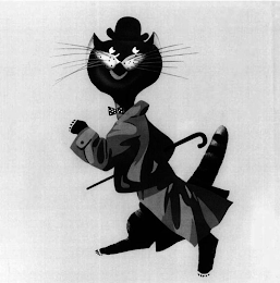 The mark consists of a design of a stylized cat in a coat with a cat and a bowtie with dots and carrying a cane in one arm.