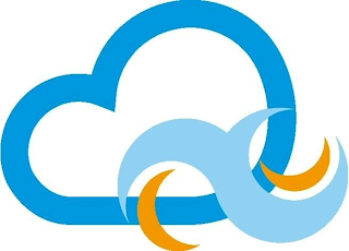The mark consists of the thick outline of a cloud figure in blue in the background, with a combination of a storm cloud element shown in light blue depicted on the lower right of the cloud's outline and two small thin moon crescents in orange depicted on both sides of the storm cloud element.