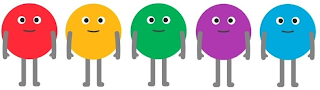 The mark consists of five figures consisting of a color shaded circle with black and white eyes and black mouth, two grey arms and two grey legs, standing horizontally in relation to each other with the circles colored from left to right in red, yellow, green, purple and blue.