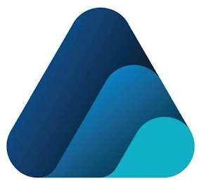 The mark consists of a triangle with curved corners and diagonal bands of light blue, blue, and dark blue.