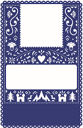 The mark consists of a blue rectangle with a scalloped blue and white edging, which contains inside it a white square with a zig-zag edge above a white rectangle with rounded corners; around the outer edges of the larger blue rectangle is a white dotted line, to the right and left of the inner square is the blue and white stylized representation of two cows' heads above two white flowers, and in between the inner square and rectangle is a white heart; beneath the inner rectangle is the blue and white stylized representation of a mountain range, flanked on either side by two blue and white castles with white flowers overhead, which in turn are flanked by two white trees. Forming a decorative pattern in between the aforementioned formations are several small blue and white triangular, square, diamond, chevron, and curving filigree shapes.
