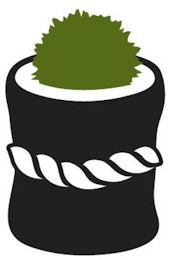 The mark consists of a black sushi roll wrapped in a white rope. Inside the sushi is a green plant and white space. White appearing elsewhere in the mark represents background, outlining, shading, and/or transparent area and is/are not part of the mark.