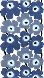 The mark consists of a repeating pattern of alternating rows of blue, light blue, and grey flower designs that appears on the surface of the goods. The flower designs feature black stems and black dots in the center of the flowers. The white represents background or transparent areas and is not part of the mark.