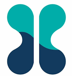 The mark consists of two curved shapes, both split in the middle, with the top halves shaded in green, and the bottom halves shaded in blue.